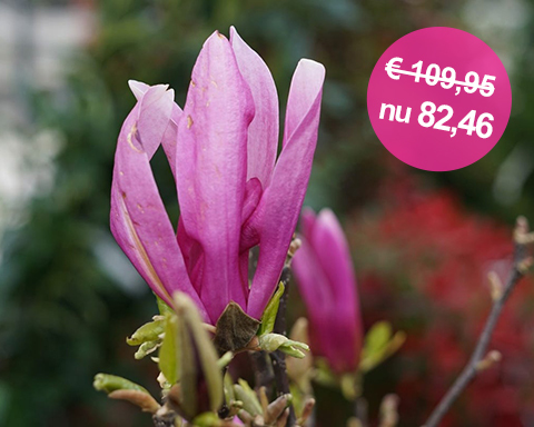 | Magnolia 'Susan' 25% korting | Magnolia 'Susan' als struik. Een beverboom die kleiner blijft en bloeit met donkerroze bloemen vanaf half april. Soms geeft deze Magnolia een minder uitbundige nabloei in de zomer. De actie geldt alleen voor de maat 125/150 cm. | naar de actie |